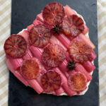 10. Remove the cheesecake from the fridge and pop out of the tin. Then decorate with your sliced blood orange and rhubarb. Use the rest of the delicious juices as a sauce.