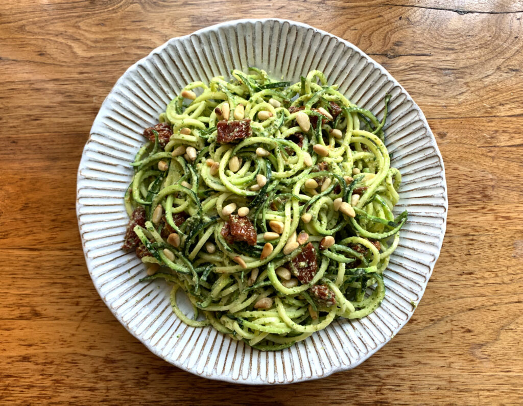 A lovely zesty and creamy pesto courgette salad paired with salty sweet sun-dried tomatoes. It’s a is a perfect way to use up your glut…