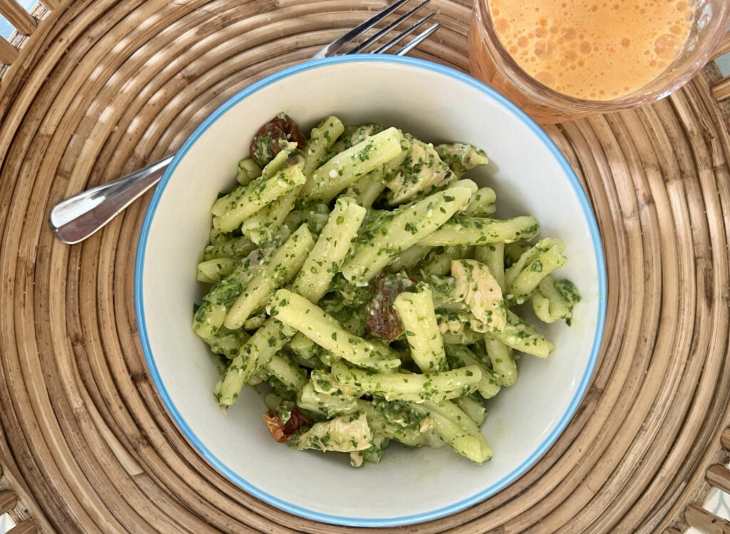 Salmon, basil, and sun-dried tomatoes make such a brilliant taste sensation and is always a winner. Even better when the pesto is made from kale…