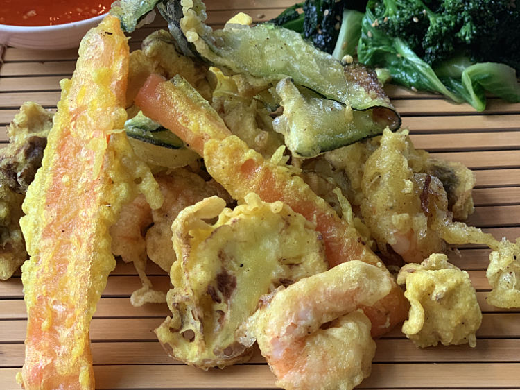 Tangy Turmeric Tempura Prawns & Veg with Honey Lemon Greens