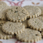 A close-up of round, scalloped-edge crackers with speckled herbs, arranged in a pile on a decorative plate. The crackers appear homemade with a rustic texture.