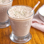 Two glasses of chocolate smoothies with frothy tops sit on a wooden table. One glass has a striped straw. In the background, a small bowl with white seeds rests on a pink cloth.