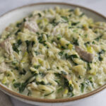 This creamy chicken one-pot wonder is a perfect recipe for a quick and comforting lunch or supper. Orzo is small rice-shaped pasta which cooks super-fast and absorbs all the delicious and nutritious chicken stock. Tender chicken, leek and spinach are then all folded into a simple cheesy sauce.