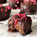 Heavenly chocolate bites of goodness with a gooey raspberry and almond butter centre. A divine combination of dates, almond butter, raspberries and chocolate, they are a cinch to make. These make a wonderful nutritious snack or sweet treat to be eaten at the end of a meal. Use dark, milk, white or vegan chocolate – they all taste amazing.