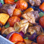 Peel the sweet potatoes and chop into 2.5cm chunks. Deseed the peppers and chop into similar size pieces. Cut the red onion into 8 wedges. Quarter the chicken thighs and then add everthing into a roasting tin, along with the cherry tomatoes.