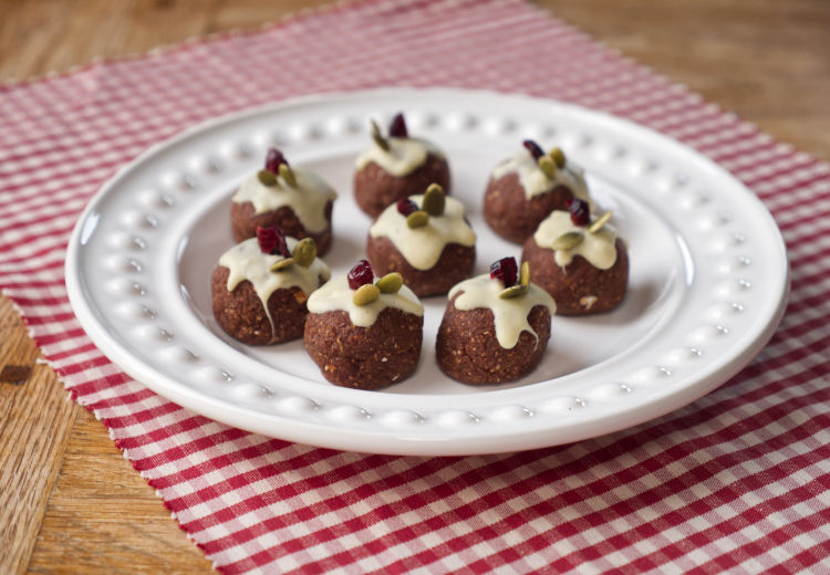 - Once the balls have cooled, melt the white chocolate in a bowl over simmering water. Smooth a blob of melted chocolate on the top of each ball using a teaspoon. Then decorate with the dried cranberries and sunflower seeds to represent the Christmas pudding icing, holly and berries.
