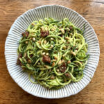 A lovely zesty and creamy pesto courgette salad paired with salty sweet sun-dried tomatoes. It’s a is a perfect way to use up your glut of courgettes over the summer months.