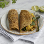 They are inspired from the dosas we loved when my husband and I lived in South India, but they don’t come out so crispy and thin. I recommend you try serving these pancakes with your favourite South Indian curry fillings. They are delicious served on their own and we love them folded around dal or a coconut-based prawn curry with some fresh coriander and a squeeze of lime. You can also dip them into cucumber raita or an Indian chutney or sambar.