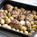 Here is a simple wonderful chicken and potato tray bake that makes a winning family dinner! Simple seasonal apple butter lends a fantastic natural sweetness to the marinade for these tasty chicken thighs, making them extra sticky and delicious!