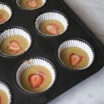 - Pop a slice of strawberry in the middle and on the top of each muffin.