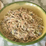 6. Combine the dry ingredients with the dressing to make the coleslaw and serve in a pretty bowl.