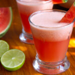 A glass of fresh watermelon juice with a frothy top, garnished with a watermelon slice. Next to the glass are halved limes and a wedge of watermelon on a wooden surface. Another glass of juice is in the background.