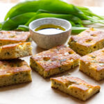 This is a highly-nutritious wheat and gluten-free focaccia style bread which I have developed, swapping the white flour for ground almonds and chickpea flour. It is still lovely and fluffy and at the same time will keep tummies fuller for longer. It also packs in some fibre, iron and calcium. People on a low FODMAP diet can usually tolerate wild garlic, so this a great option for those with sensitive or gassy tummies.