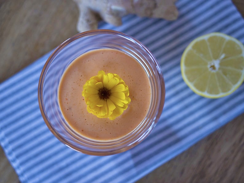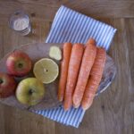 Apples contain high levels of vitamin C and this may be why the British have traditionally said that “an apple a day keeps the doctor away”. Carrots are stuffed full of vitamin A which may help eye health as well as immunity. Ginger helps to settle the stomach and is one of nature’s antimicrobials and decongestants, so a good to include when you have a snuffle or a sore throat. The lemon juice and baobab provide additional vitamin C and a lovely fresh flavour.